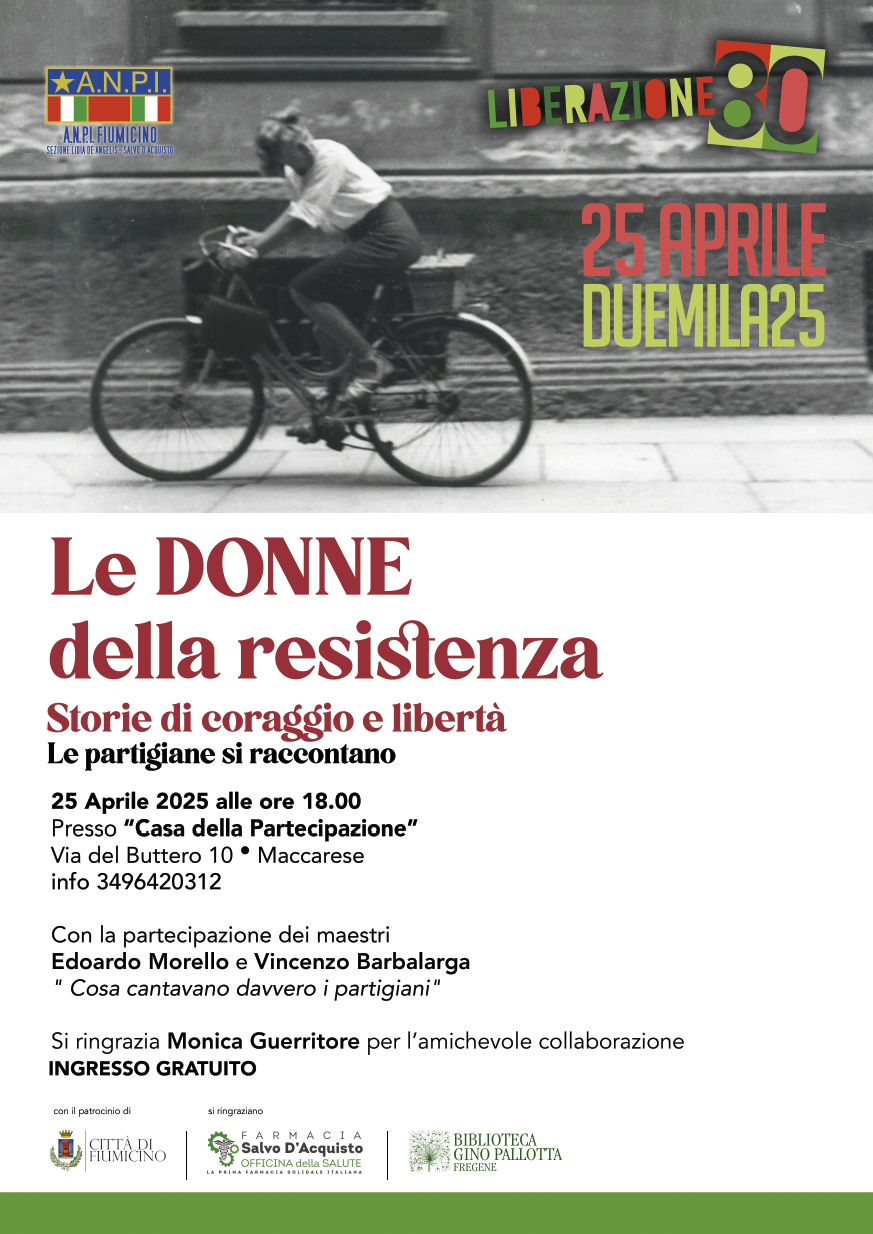 L’A.N.P.I. Sezione di Fiumicino “Lidia De Angelis – Salvo D’Acquisto” – organizzazione militante di memoria attiva e di impegno civile – per celebrare l’ottantesimo anniversario della Liberazione dal nazifascismo, in difesa della Costituzione e per la pace, organizza per il 25 aprile, alle ore 18:00, presso la Casa della Partecipazione a Maccarese, l’iniziativa intitolata: “Le Donne della Resistenza – Storie di coraggio e libertà”.