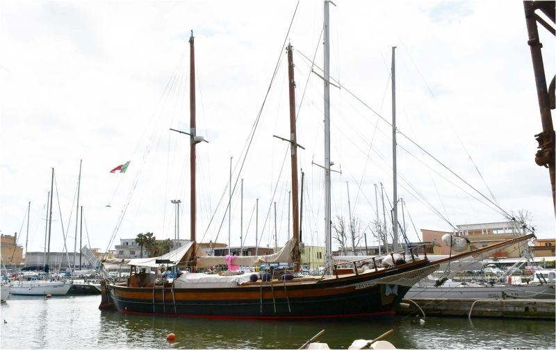 Il caratteristico bompresso e i due grossi alberi armati con vele non passano inosservati tra le circa 200 imbarcazioni da diporto ormeggiate nello specchio acqueo della darsena di Fiumicino.