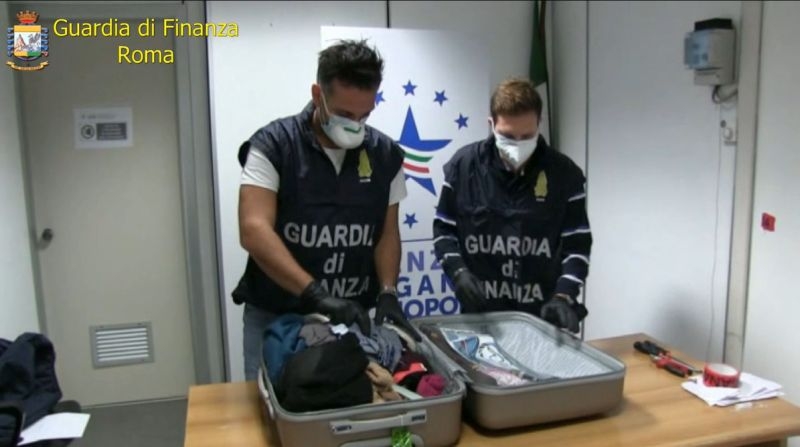 Due uomini di nazionalità ucraina, provenienti da Santiago del Cile, avevano invece predisposto, nelle pareti laterali dei loro bagagli a mano, appositi doppifondi contenenti oltre 5 chilogrammi di cocaina.