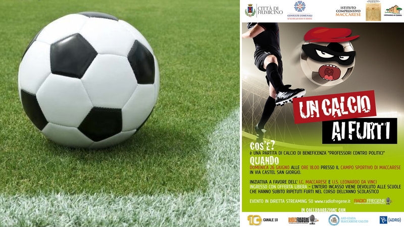 Domenica 26 giugno, tutti al campo sportivo di Maccarese in via Castel San Giorgio, alle ore 18:00, con ingresso con offerta libera, per assistere alla partita di calcio di beneficenza “Un calcio ai furti” dove sul campo si sfideranno professori contro politici.