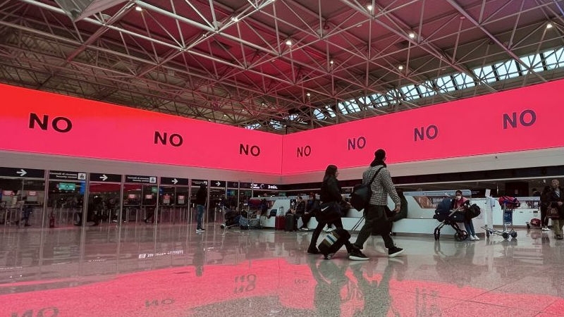 Cronaca"NO" Contro la violenza sulle donne, oggi la scritta sui maxi schermi nel T1 del Leonardo da Vinci