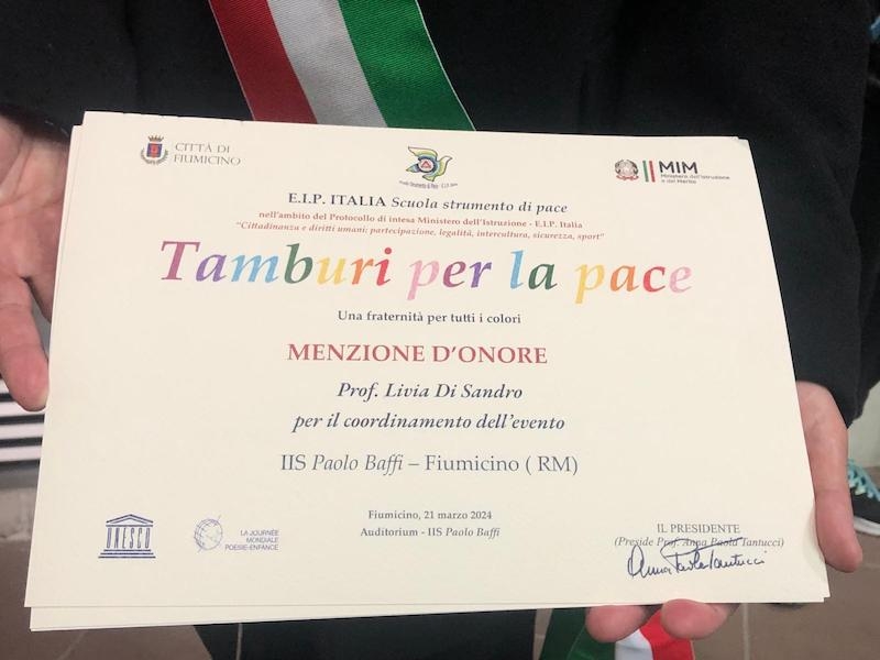 Cronaca“Tamburi per la pace – Una fraternità per tutti i colori”: all’ISS Baffi di Fiumicino oltre 200 ragazzi in un flash mob
