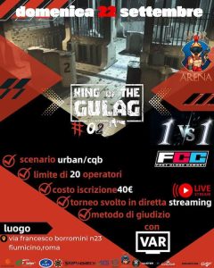 Domenica prossima, 22 settembre, sarà invece realizzato l’evento “King of the gulag” un torneo di FFC che vedrà la partecipazione di 20 operatori che si sfideranno nella Spqr Arena di Via Francesco Borromini. Al fine di far conoscere tale attività stiamo organizzando per il prossimo fine settimana un open day aperto a bambini, ragazzi ed adulti, dove si potrà provare lo speed-soft, indossando tutte i dispositivi di sicurezza e di gioco necessari per entrare nell’arena. Gli interessati potranno poi essere formati direttamente in loco, con lo scopo di conoscere le varie tecniche ed abilità necessarie per divertirsi e giocare insieme in team”. – ha concluso Emanuele Salvatore.