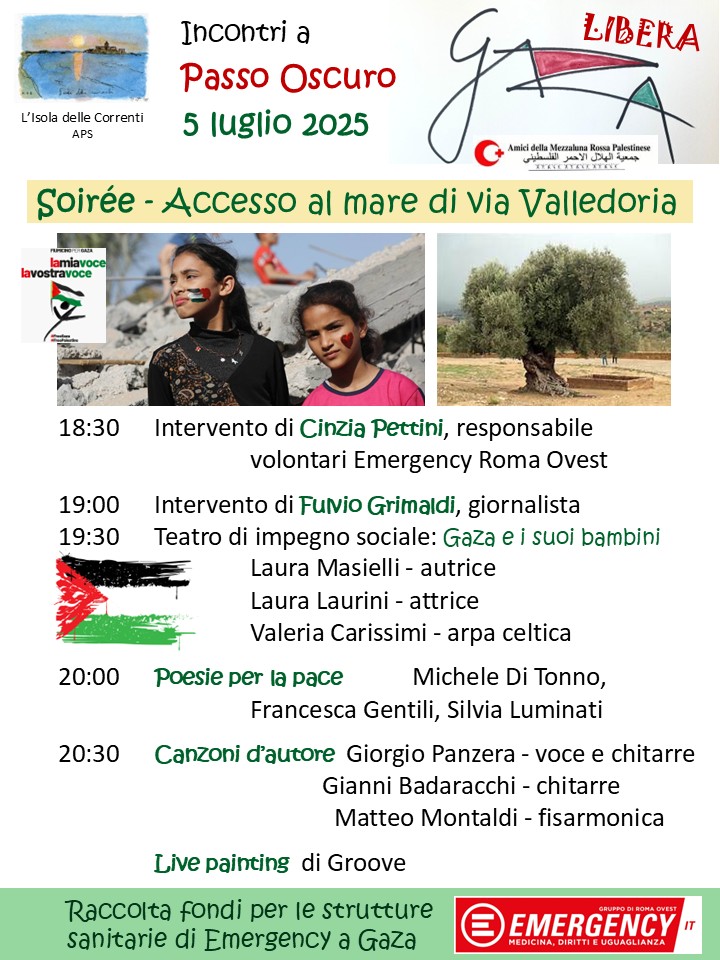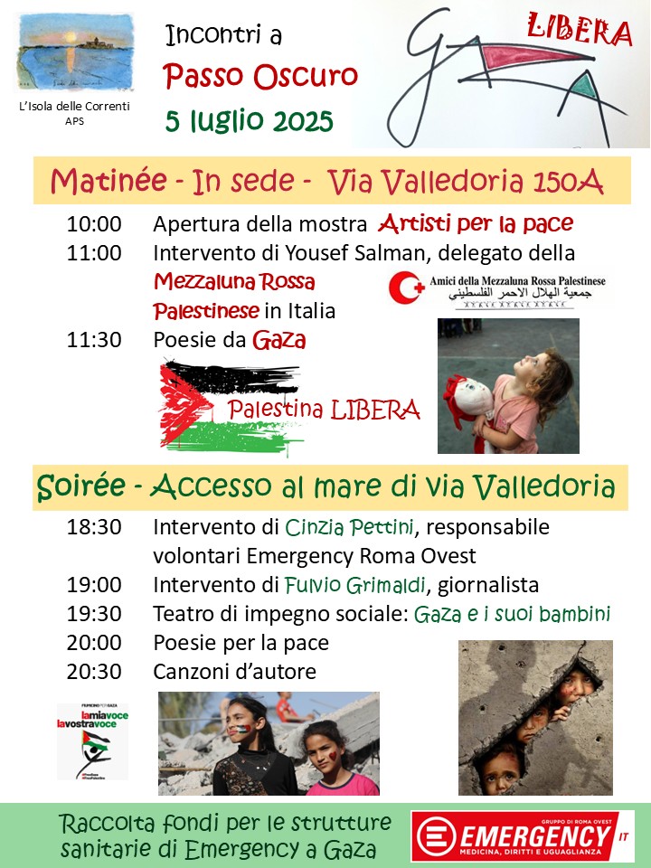 L’associazione L’Isola delle Correnti A.P.S. presenta “Artisti per la Pace – Contro tutte le guerre”, una giornata dedicata alla solidarietà con le popolazioni di Gaza, attraverso una mostra pittorica finalizzata alla raccolta fondi per le strutture sanitarie di EMERGENCY operanti nel territorio.