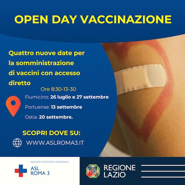 Dopo la prima data che ha interessato la Casa della Salute di Ostia, altre quattro sono state inserite nel programma fino al prossimo settembre in attesa della definizione di altri incontri. I prossimi Open Day sono previsti nei centri vaccinali di Via Giorgio Giorgis 56 a Fiumicino (26 luglio e 27 settembre), di Via Portuense 575 a Roma il 13 settembre e sul Lungomare Toscanelli 230 di Ostia il 20 settembre.
