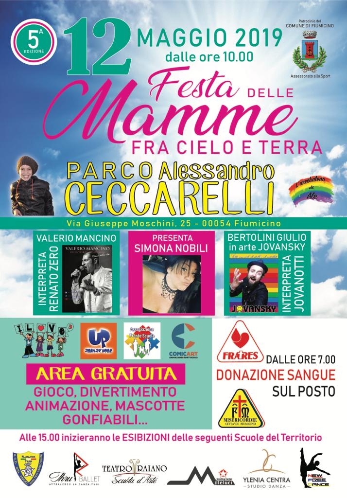 Domenica 12 maggio, per il quinto anno consecutivo, l’Associazione l’Arcobaleno di Ale organizzerà la 5° edizione della “Festa delle mamme tra cielo e terra“, l’evento dedicato a tutte le mamme in particolar modo a tutte quelle che dividono il proprio amore tra “cielo e terra”. L’evento si terrà presso il Parco pubblico dedicato ad Alessandro Ceccarelli, in via Giuseppe Moschini a Fiumicino.
