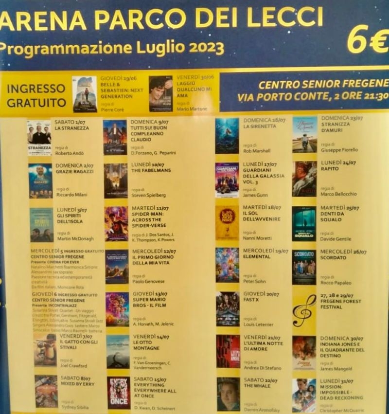 Gli appuntamenti hanno inizio alle 21.30 per un costo di 6 euro. Due serate saranno invece a ingresso gratuito, in occasione dei concerti del 5 ( Cinema for ever) e 6 luglio (Incontrinjazz). i film che hanno segnato la stagione cinematografica in rassegna: domani “Gli spiriti dell’isola”, il 7 Il gatto con gli stival, l’8 Mixed by Erri, il 9 Tutti su! Buon compleanno Claudio. Ed ancora The Fabelmans (10), Spider man Across the Spider-Verse (11), Il primo giorno della mia vita (12), Super Mario Bros-il film (13), Le otto montagne 814), Everything Everything all at once (15), La sirenetta (16), Guardiani della Galassia vol.3 (17), Il sol dell’Avvenire (18), Elemental (19), Fast X (20), L’ultima notte di amore (21), The Whale (22), Stranizza d’amuri (23), Rapito (24), Denti da squalo (25), Scordato (26), Indiana Jones ed il quadrante del destino (30), Mission impossible – Dead Reckoning (31). L’Arena ospiterà dal 27 al 29 luglio il Fregene Forest Festival.