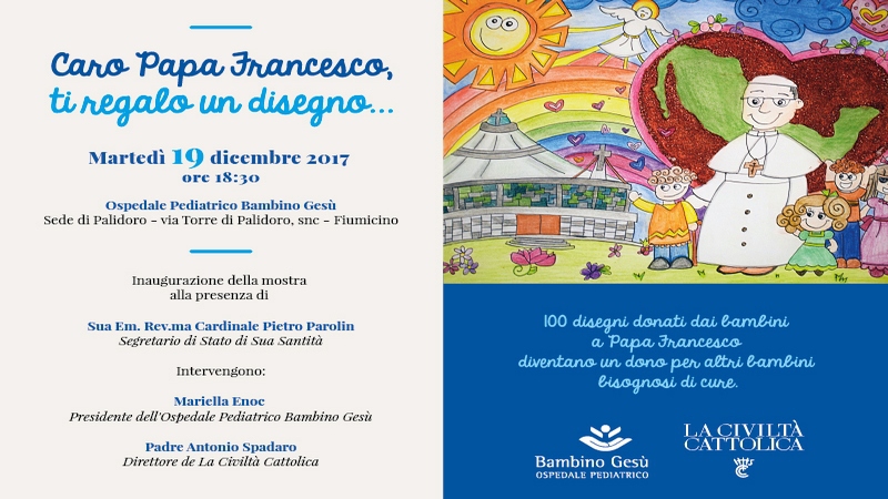 LA MOSTRA DEI DISEGNI E LA CAMPAGNA DI SENSIBILIZZAZIONE I disegni realizzati dai bambini e donati a Papa Francesco nel corso dei suoi viaggi e dei suoi incontri sono esposti nella mostra “Caro Papa Francesco, ti regalo un disegno” inaugurata il 19 dicembre, nella sede del Bambino Gesù di Palidoro, sul litorale laziale (Via Torre di Palidoro, Fiumicino) alla presenza del cardinale segretario di Stato della Santa Sede Pietro Parolin.