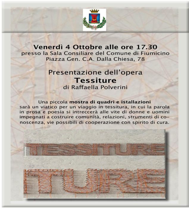 Venerdì 4 ottobre, alle 17.30 presso l’Aula Consiliare del Comune di Fiumicino, si terrà la presentazione dell’opera “Tessiture” di Raffaella Polverini.