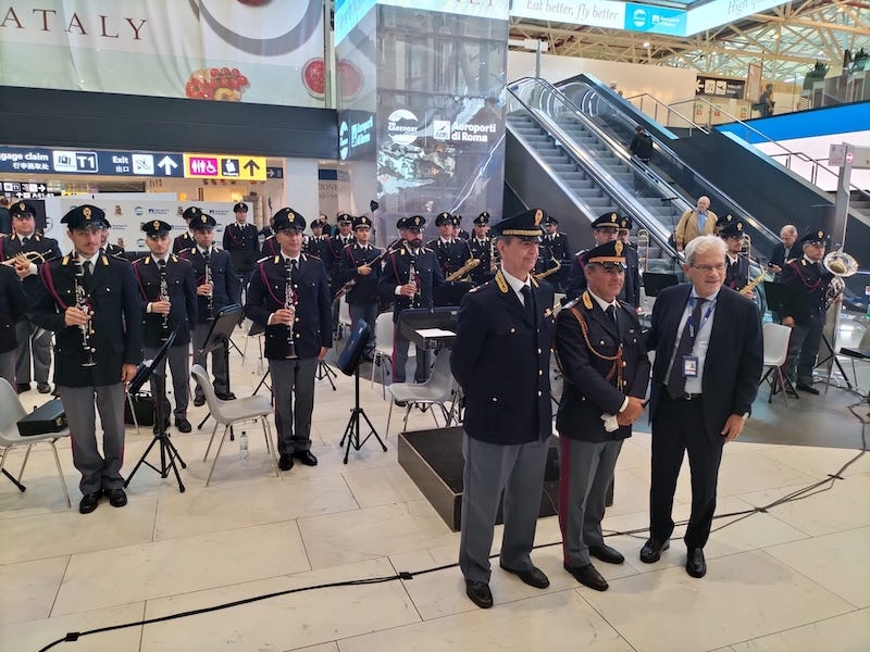 Grande successo oggi a Fiumicino per il concerto della Fanfara della Polizia di Stato. Nella cornice della nuova area di imbarco A per i voli nazionali e Schengen del Leonardo da Vinci, 40 elementi si sono esibiti in brani classici e moderni sotto gli occhi piacevolmente stupiti di passeggeri e operatori.