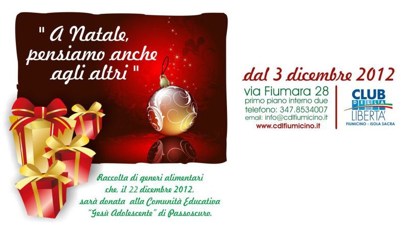 Per il terzo anno consecutivo, nell’approssimarsi del Natale, il Club della Libertà di Fiumicino – Isola Sacra, attraverso il suo Presidente, Cristiano D’Intino ed i componenti del Consiglio Direttivo, tende la mano ai più deboli organizzando una raccolta di generi alimentari da destinare alla Comunità Educativa “Gesù Adolescente” di Passoscuro.
