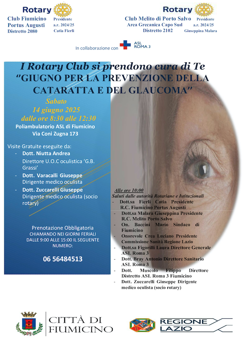 Sabato 14 giugno 2025, dalle ore 8:30 alle 12:30, presso il Poliambulatorio ASL di via Coni Zugna a Fiumicino, si terrà l’evento “Giugno per la prevenzione della cataratta e del glaucoma”. L’iniziativa, patrocinata dal Comune di Fiumicino, è organizzata dal Rotary Club, in collaborazione con la ASL RM3.