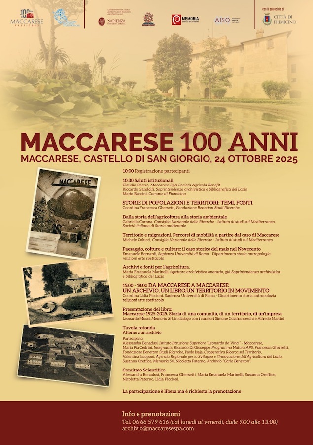 Per l’occasione, la Maccarese S.p.A. ha organizzato l’evento “Maccarese 100 anni”, patrocinato dal Comune di Fiumicino, che si terrà il 24 ottobre, dalle ore 9:30 alle 18:00, presso il Castello di San Giorgio. La partecipazione è libera. È richiesta la prenotazione al numero 06/66579616 (Lun–Ven dalle 9:00 alle 13:00) oppure via email a archivio@maccaresespa.com