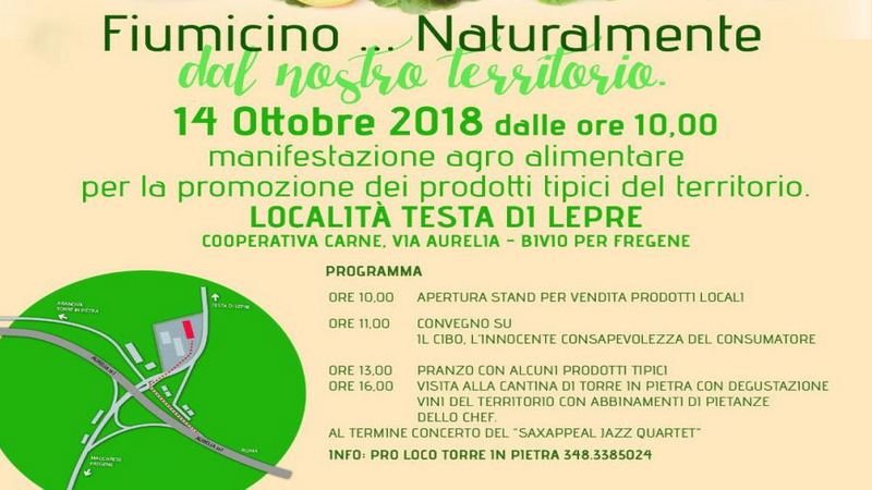 Mercoledì 10 ottobre, alle ore 12.30, presso la Sala Matrimoni del Comune di Fiumicino la conferenza stampa di presentazione di “Fiumicino… naturalmente dal nostro territorio”, la manifestazione agroalimentare per la promozione dei prodotti tipici del territorio organizzata dall’Assessorato alle Attività produttive, Agricoltura e Pesca, in programma domenica 14 ottobre a Testa di Lepre.