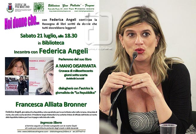 , cronista del quotidiano La Repubblica, presenterà il suo ultimo libro “A mano disarmata . Cronaca di millesettecento giorni sotto scorta” sabato 21 luglio, alle ore 18,30, presso la Biblioteca Gino Pallotta di Fregene (Viale della Pineta 140). Dialogherà con lei la giornalista di La Repubblica FRANCESCA ALLIATA BRONNER.