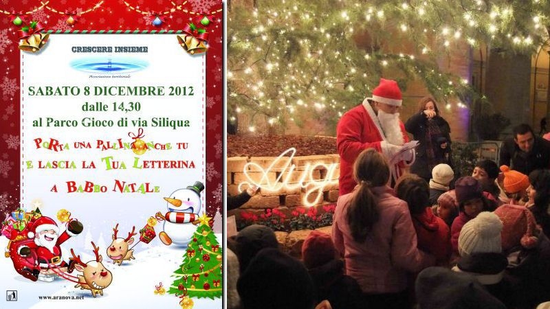 “L’albero di Natale? Anche quest’anno ce lo facciamo da soli, con l’aiuto di tutti i bambini di Aranova – l’iniziativa dell’associazione Crescere Insieme è semplice – hai un bambino? Sabato 8 dicembre dalle 14.30 in poi lo aspettiamo al parco giochi di via Siliqua insieme a una pallina con scritto il suo nome e una letterina che sarà poi consegnata a Babbo Natale in persona, per l’occasione catapultato dalla Lapponia in esclusiva per noi. Perché? Semplice: creare l’albero di Natale più bello di Aranova e dell’intero comune di Fiumicino”.