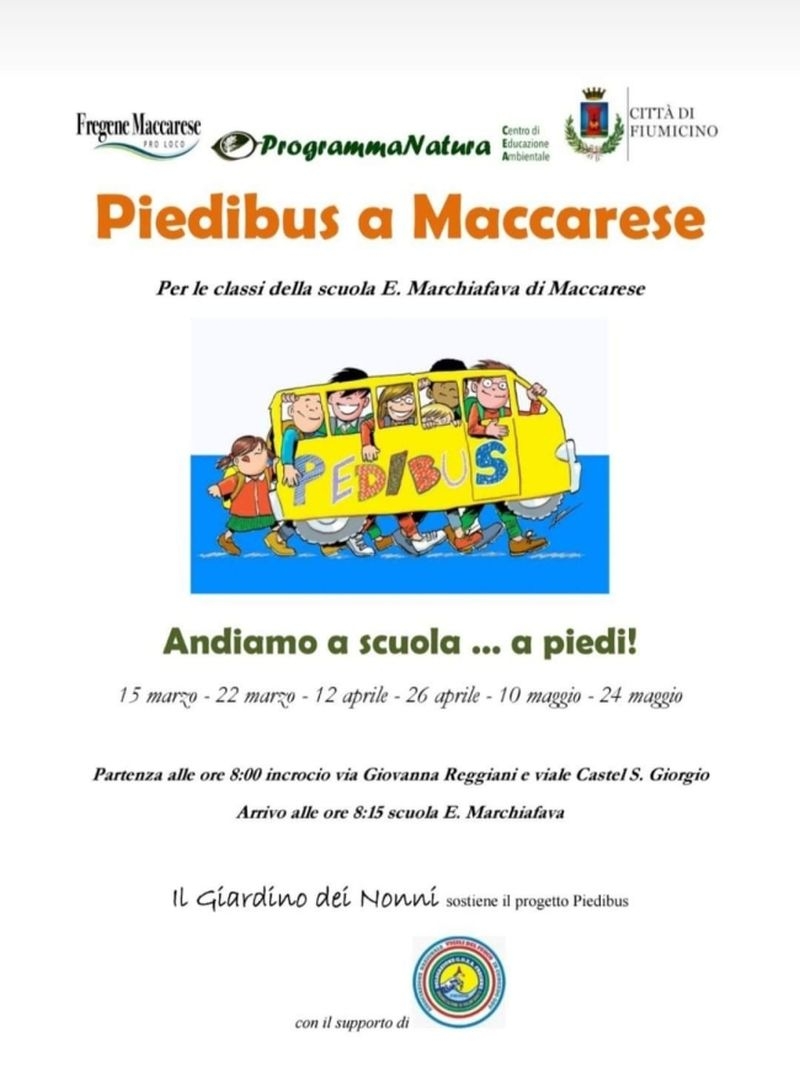 Al via domani, a Maccarese, il primo di sei appuntamenti con il “Piedibus”: 50 piccoli alunni della “E. Marchiafava” andranno a scuola, per circa un chilometro, con l’ “autobus che va a piedi”. L’iniziativa è promossa e ideata da Programma Natura Aps in collaborazione con la Pro Loco Maccarese Fregene ed il Comune di Fiumicino.