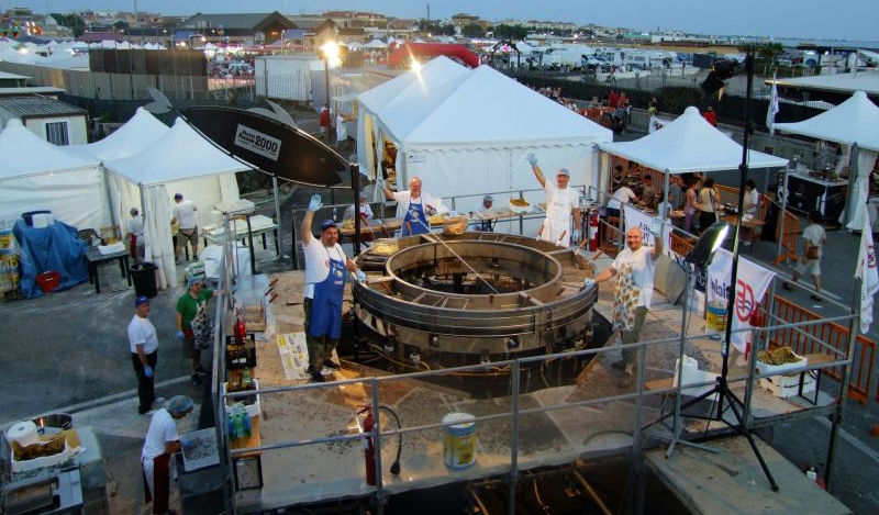 L’ormai caratteristica padella gigante friggerà circa 25 quintali di totani, calamari, gamberi, pesce di paranza, mentre 6 quintali di cozze finiranno in sauté.