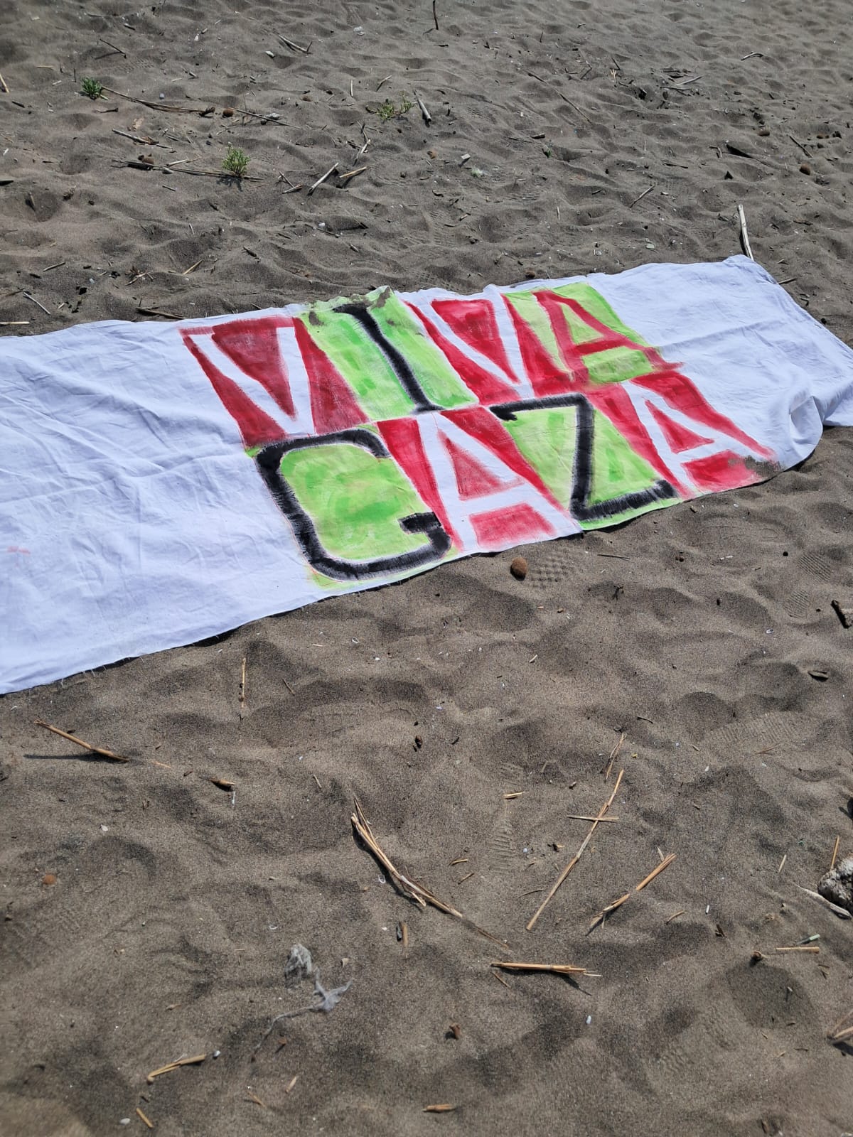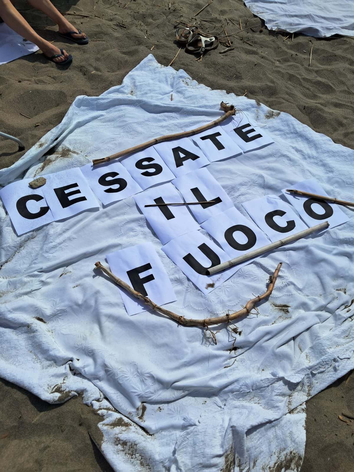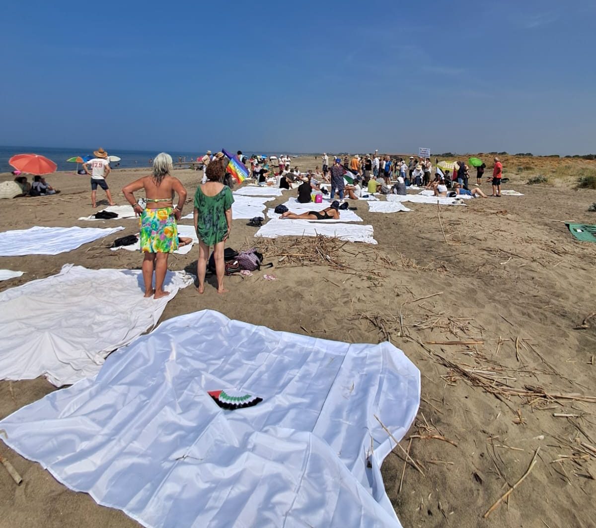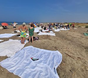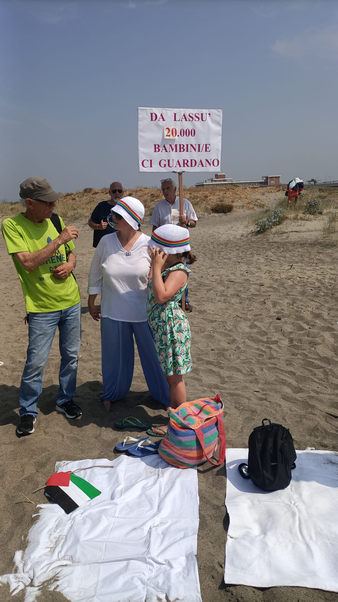 Circa 120 persone questa mattina si sono ritrovate sulla spiaggia libera di Passoscuro dando vita a un flash mob per esprimere simbolicamente e pacificamente il proprio orrore di fronte a quanto sta accadendo ormai da oltre venti mesi a Gaza.