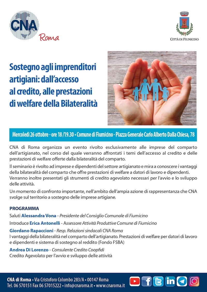 “Il seminario – aggiunge –, rivolto alle imprese del comparto dell’artigianato, affronterà i temi dell’accesso al credito e delle prestazioni di welfare offerte dalla bilateralità del comparto. Oltre a me interverranno: Giordano Rapaccioni, Responsabile Relazioni sindacali CNA Roma, Andrea Di Lorenzo, Consulente Credito Coopfidi Credito Agevolato per l’avvio e sviluppo delle attività. Porterà i saluti istituzionale la Presidente del Consiglio Comunale di Fiumicino Alessandra Vona.