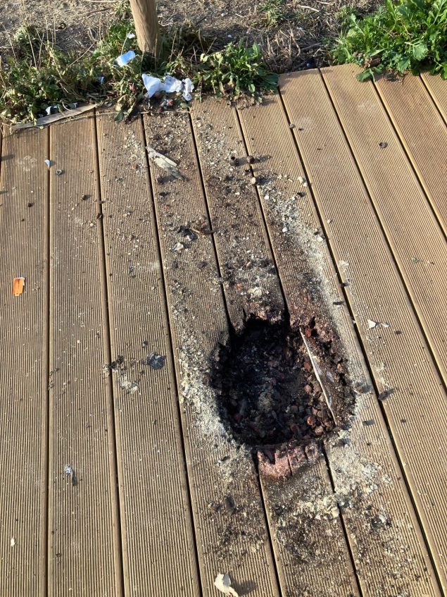 La passerella ciclopedonale in legno, a Passoscuro, danneggiata per via di un cratere causato da fiamme o da “botti”, tamponato temporaneamente da un’utente riempiendolo con della sabbia (vedi foto): come segnalato sui social da diversi utenti, è uno degli aspetti negativi ereditati, sul territorio di Fiumicino, nella notte di San Silvestro.