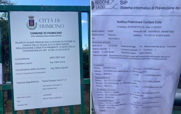 “All’ingresso sono stati rilevati due diversi cartelloni di cantiere, uno della ARES 2002 SpA, che indica come data di inizio lavori il 22 settembre 2025 e l’altro della Regione Lazio, che riporta invece il 2 ottobre 2025 come data di avvio – riferisce Strocchi – Nonostante entrambe le date siano ormai trascorse, sul posto si è constatata soltanto la presenza di qualche mezzo meccanico e di alcune grandi tubazioni che dovranno costituire il tracciato della condotta”.