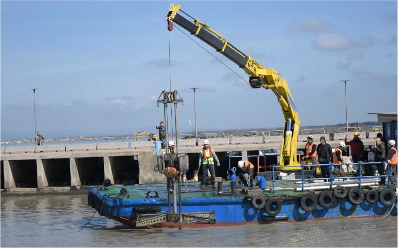 Utilizzando il “vibrocarotaggi”, il personale specializzato della società MTM Service, si è soffermato stamani in determinate zone del fiume e dell’approdo, prelevando materiale dal fondale fino a oltre un metro sotto la superficie del letto del fiume. I cilindri di materiale prelevato sono stati affidato ai tecnici di un laboratorio toscano che ora dovranno analizzare i detriti “pescati” prima di iniziare l’escavo con il trasferimento di sabbia mista a fango nella seconda vasca di colmata del costruendo porto commerciale alla destra della foce della Fossa Traianea.