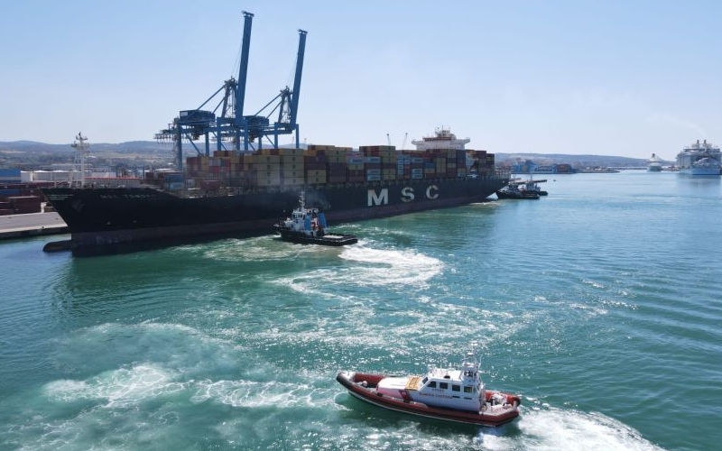 Due giganti del mare, uno di fronte all’altro, nel porto di Civitavecchia. Questa mattina ha attraccato, per la prima volta nel porto di Roma, la nave portacontainer Msc “Tomoko”, la più grande mai ormeggiata nel locale scalo marittimo: 332 metri di lunghezza ed una capacità di carico di 8400 contenitori.