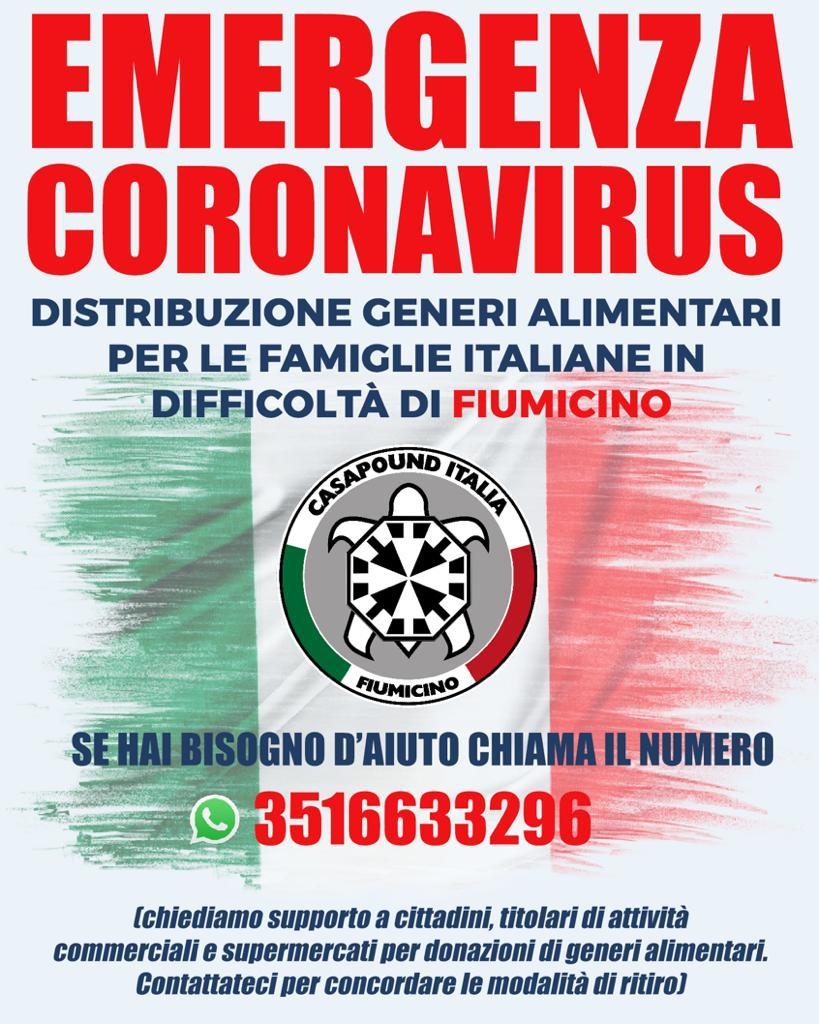 Durante il periodo di crisi, anche CasaPound raccoglie beni di prima necessità da distribuire a persone e famiglie in difficoltà. “Anche il nostro movimento in campo per aiutare le famiglie in difficoltà del nostro comune”, si legge in una nota di CasaPound. “In questi giorni i nostri militanti di Fiumicino stanno raccogliendo beni di prima necessità che andranno a distribuire già da questo fine settimana a famiglie che si trovano in stato di emergenza a causa della crisi che sta attraversando la nostra nazione. La nostra opera – conclude la nota – si protrarrà per la durata di tutta la crisi ed invitiamo i nostri concittadini in stato di emergenza a contattarci al numero 351 663 3296″.