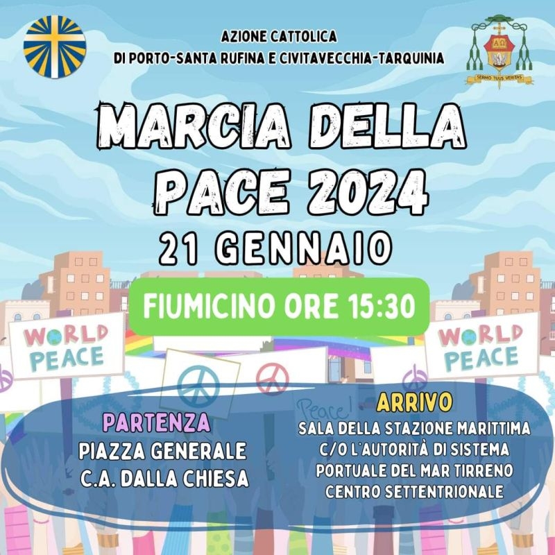 Domenica 21 gennaio, a Fiumicino, è in programma la “Marcia della Pace 2024”. L’iniziativa è promossa dall’Azione Cattolica delle Diocesi di Porto-Santa Rufina e Civitavecchia-Tarquinia. Alla presenza, tra gli altri, del Vescovo diocesano Gianrico Ruzza, il raduno, che vedrà il saluto del sindaco di Fiumicino Mario Baccini, è alle 15.30 in piazza Generale Carlo Alberto Dalla Chiesa, vicino alla sede comunale. L’arrivo è previsto alla Sala della Stazione Marittima in piazzale Mediterraneo.