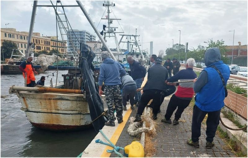 “È stata avvertita la Guardia Costiera che si è precipitata in banchina mentre i pescatori stavano predisponendo il sollevamento del gommone – previsa Gennaro Del Prete, presidente della coop Pesca Romana – Utilizzando la fune principale delle reti per lo strascico siamo riusciti a sollevare il relitto che è stato poi adagiato sulla banchina». La preoccupazione della categoria è che il gommone, in balia della corrente, avrebbe potuto provocare danni agli scafi della flotta e alle eliche“.