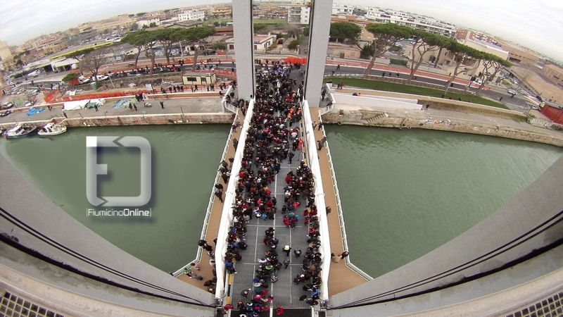 LA STORIA DEL PONTE DUE GIUGNO Il ponte di attraversamento della Fossa Traianea, distrutto dai nazifascisti nel 1944, fu riedificato con maggior grandezza del precedente. Era, infatti, il 25 febbraio 1948 quando fu inaugurato il grande progetto a sollevamento chiamato così in onore nella neonata Repubblica Italiana. Ma la sua storia non nasce nel dopoguerra. Fiumicino da sempre “divisa” è stata unita nei secoli da una serie di ponti che hanno reso possibile passaggi e congiunzioni altrimenti impensabili. La presenza di attraversamenti sul canale di Fiumicino, Fossa Traianea, è nota fin dall’epoca romana. La città di Porto, infatti, si estendeva da entrambe le parti del fiume Tevere e resti storici di uno di questi restano nel punto in cui l’antica via Flavia Severiana giunge nei pressi del Tevere. Si hanno notizie di un altro ponte a metà del ‘500 da Domenico Boccamazza capo caccia di Papa Leone X che lo descrive in un vernacolo probabilmente collocato all’altezza dell’attuale Torre Niccolina. Più recentemente, nel 1800, è documentata la presenza di un ponte di barche costruito dalla Reveranda Camera Apostolica poco a monte dell’attuale 2 Giugno distrutto da una forte inondazione nel 1802. Fu ricostruito altre due volte, l’ultima nel 1815. Nei primi decenni del ‘900 i movimenti che andavano incrementando lungo le sponde diedero il lasciapassare alla costruzione di un nuovo attraversamento. Il ponte fu costruito all’altezza della via Demaniale, l’attuale via del Faro e in linea con la Chiesa del Crocifisso.
