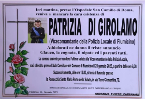 Di Girolamo ricopriva anche il ruolo di Responsabile del reparto Anti Violenza di genere ed era stata molto attiva anche nella protezione civile come responsabile. Centinaia le attestazioni, sui social e non, di cordoglio nella cittadinanza che la ricorda per la sua professionalità ed umanità. Anche il Consiglio di Amministrazione, la direzione e tutto il personale della Fiumicino Tributi piange la scomparsa di Patrizia Di Girolamo e si “stringe attorno alla sua famiglia e agli amici per il grave lutto che li ha colpiti”. “Patrizia, nei tanti anni di collaborazione con la società nel comparto che riguarda il Codice della strada, è sempre stata una persona seria, attenta, disponibile e affidabile. La Fiumicino Tributi, il Corpo di Polizia Locale e tutta la Città di Fiumicino, perdono un grande punto di riferimento che ha sempre svolto il suo compito con grande dedizione e spirito di servizio”, è evidenziato.