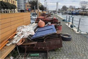 Davanti alle scalette per salire sulla banchina, all’altezza della storica locomotiva, abbandonati sacchi pieni zeppi di reti, funi di canapa e galleggianti brutti da vedere attorno ai secchini di plastica contenti attrezzature. Dalla sponda opposta sopra a un cumulo di immondizia spuntano due congelatori esternamente logorati dagli agenti corrosivi marini e circondanti da cassette e sedie di plastica oltre che da scatoloni con tante schifezze. In alcuni punti il ciglio in marmo della banchina è sprofondato nel fiume e quindi è anche pericoloso per l’attività svolta dai pescatori.