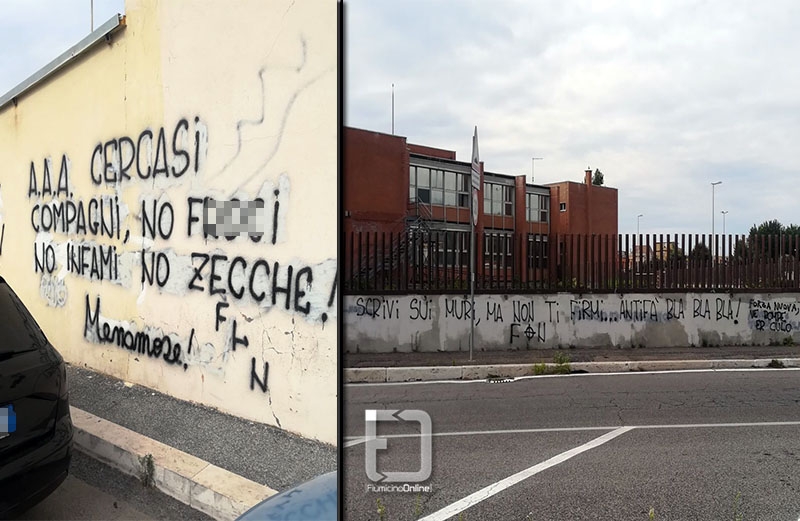 Di fronte a lui, sui muri di recinzione del plesso scolastico Emilio Segrè, un misterioso writer sbeffeggia nero su bianco un altro graffitaro “scrivi sui muri ma non ti firmi”, afferma terminando la provocazione con uno sfacciato richiamo ai due estremi politici di destra e sinistra.
