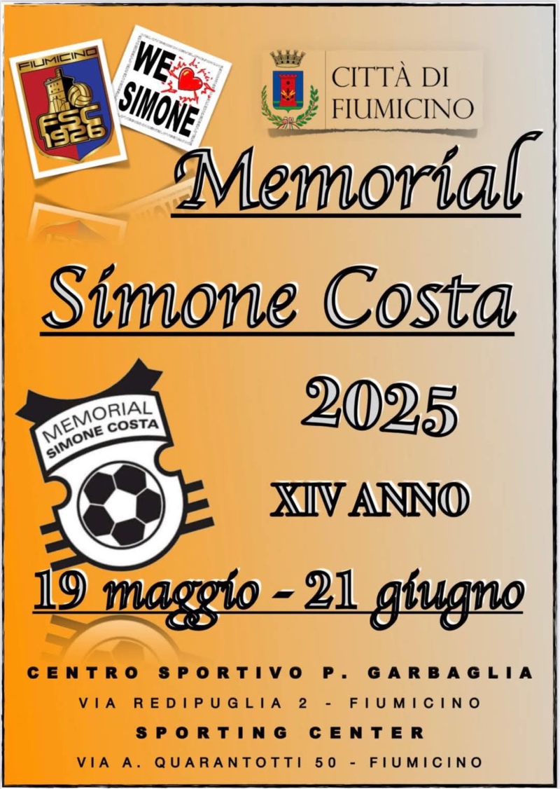 Un torneo che tiene viva la memoria di un ragazzo di Fiumicino, di 17 anni, scomparso tragicamente nel dicembre del 2011, e che è ormai anche un appuntamento calcistico giovanile tra i più attesi nel panorama laziale, cresciuto molto per l’interesse agonistico e socio-educativo. Dal 19 maggio al 21 giugno va in scena la XIV edizione del “Memorial Simone Costa”, patrocinato dal Comune, in programma presso i centri sportivi “Piero Garbaglia” e “Sporting Club Isola Sacra”, in collaborazione con il Fiumicino Calcio 1926. La famiglia Costa tiene tanto all’evento, che riunisce centinaia di ragazzi di società calcistiche romane e laziali, per un mese di sport e di sano divertimento, ricordando Simone che amava giocare a calcio nella sua città. Un evento che rappresenta una grande emozione per tutti coloro che hanno conosciuto ed amato Simone e che è diventato un punto di riferimento sportivo ed educativo.