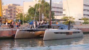 Il maxi catamarano, lungo 21 metri e largo 9,20 ha toccato l’acqua, sollevato da una gru, mostrando totalmente le sue linee: strette, filanti e tondeggianti studiate per essere un multiscafo veloce, accogliente e con grande stile. Non è passato inosservato il suo colore sabbia-dorata che con il sorgere del sole diventava via via più luminoso.