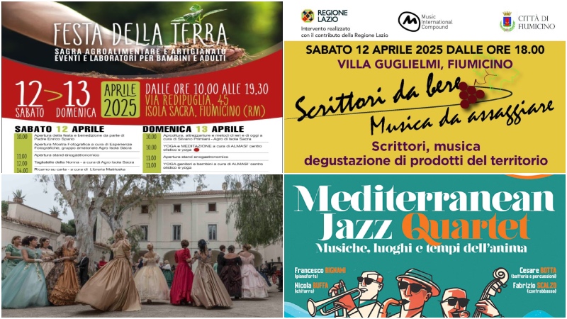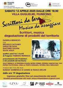 Infine, approda a Fiumicino, in 4 tappe, la manifestazione “Scrittori da bere e Musica da assaggiare“, il format ideato e organizzato dal Music international compound. Il progetto, patrocinato dal Comune di Fiumicino e realizzato con il contributo della Regione Lazio, si svolge in collaborazione con le Pro Loco, le associazioni sociali e di categoria locali, le aziende e le realtà produttive del territorio. Un vero e proprio percorso all’insegna della letteratura, della musica e dell’enogastronomia che apre i battenti sabato 12 aprile a Villa Guglielmi ad Isola Sacra, per proseguire domenica 18 maggio presso il Castello di Maccarese, domenica 14 settembre nella cantina del Castello di Torre in Pietra, e sabato 11 ottobre al Tiber Hotel a Fiumicino.