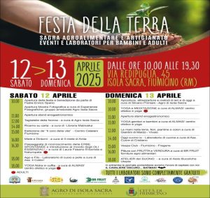 Sabato 12 e domenica 13 va in scena anche la “Festa della Terra”, in via Redipuglia, ad Isola Sacra. La sagra agroalimentare e artigianato è patrocinata dal Comune e organizzata dall’Associazione Culturale Agro di Isola Sacra. Sono previsti, a partire dalle ore 10 fino alle 18, eventi, degustazioni e laboratori ludo-didattici per bambini e adulti, tutti gratuiti, con un mercatino agro alimentare con frutta, verdura, miele, orto, fiori, accanto a stand tematici con approfondimenti e curiosità sul mondo della natura e dell’agricoltura sostenibile.