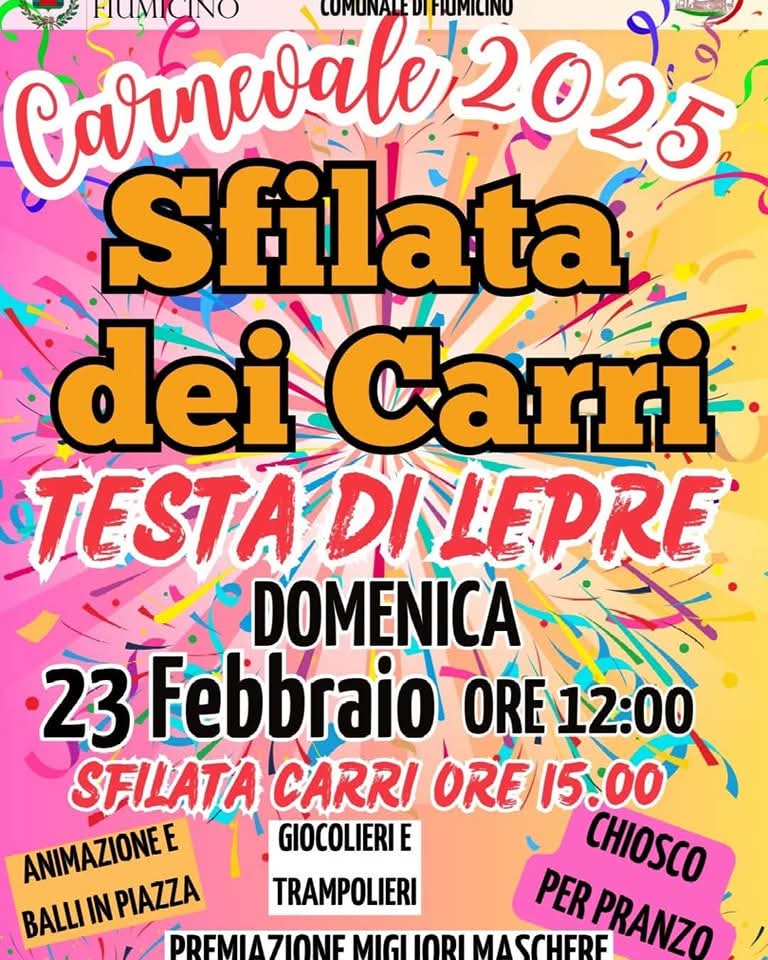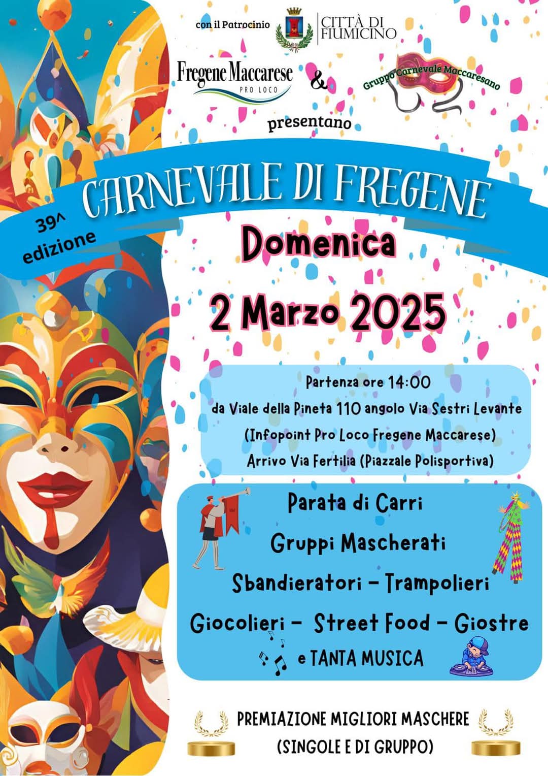 Ed ecco l’anticipazione per Fregene: la Proloco Fregene Maccarese e il gruppo “carnevale maccaresano” presentano la 39/ma edizione del “CARNEVALE DI FREGENE” in programma domenica 2 marzo. La Parate di Carri e Gruppi Mascherati, Sbandieratori, Trampolieri, Giocolieri, in una cornice di Street Food, giostre e tanta musica, partirà alle ore 14 da Viale della Pineta 110 – angolo via Sestri Levante (infopoint Pro Loco). Saranno premiate le migliori maschere (singole e di gruppo). “Unisciti a noi per creare carri allegorici e organizzare gruppi mascherati per il Carnevale di Fregene che sfileranno per le vie del paese – l’appello della Pro Loco – Invitiamo tutti a sostenere questa iniziativa con il loro prezioso supporto. È un’opportunità per dimostrare il proprio impegno verso la comunità e far parte di un evento che porta gioia e allegria a grandi e piccoli.