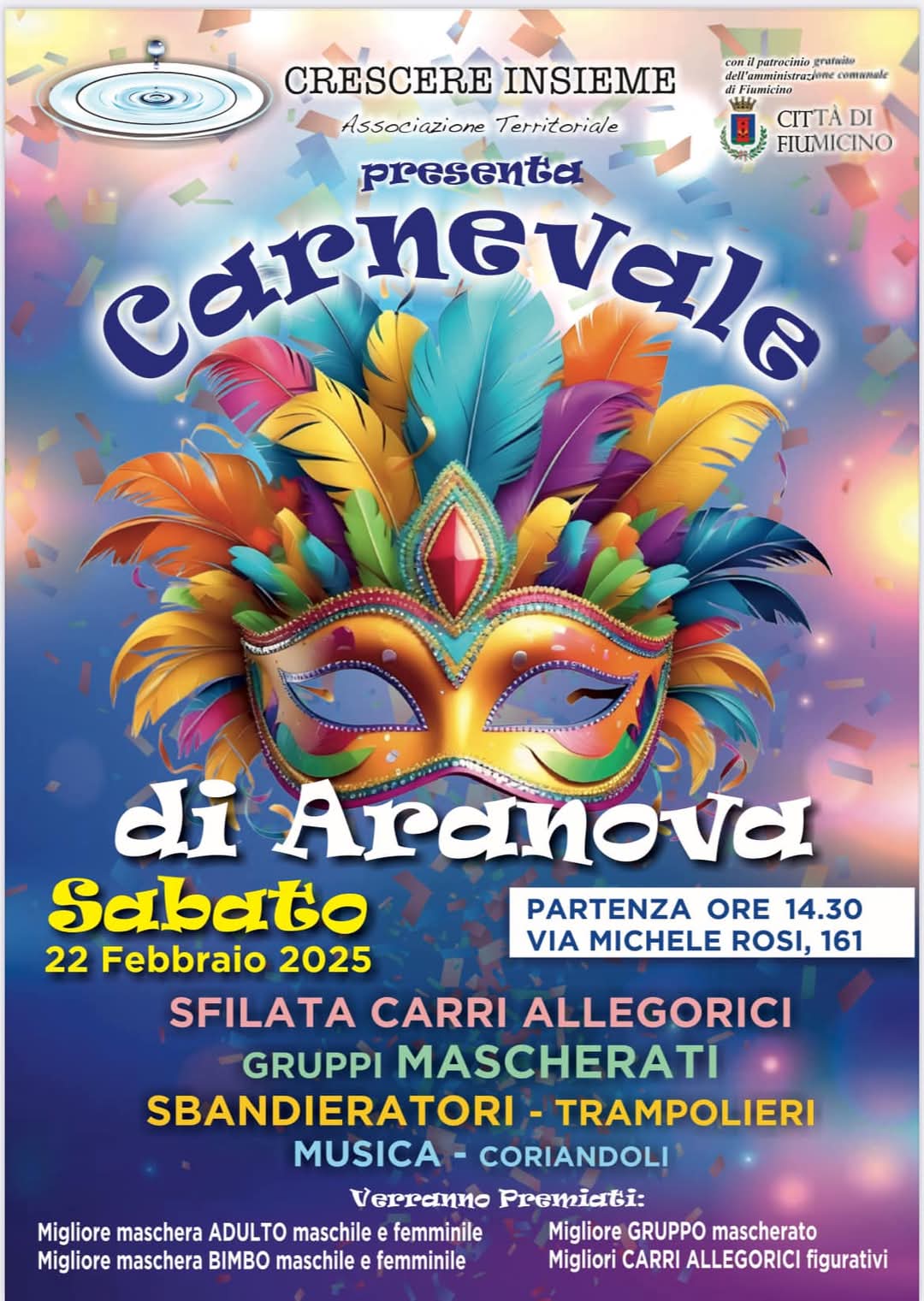 Sabato 22 febbraio, torna il Carnevale di “Crescere Insieme” ad Aranova: dalle 14, in via Michele Rosi, al via la sfilata dei carri allegorici che terminerà al centro La Tartaruga dove proseguirà la festa. Tra i temi dei carri la nave dei pirati de “La perla nera”, “La carica dei 101″ e ” Nemo” . Sarà premiato il miglior carro, il miglior gruppo mascherato, la migliore maschera adulto maschile e femminile e la migliore maschera bimbo e bimba. L’evento è patrocinato dal Comune di Fiumicino come, domenica 23, la quinta edizione della Sfilata dei carri: le quattro storiche contrade, “Borgo”, “Colonnacce”, “Malvicina” e “Prataroni” presenteranno, dalle ore 15, i quattro Carri con i temi: “Raffaella Carrà”, “Le Olimpiadi”, “Anni Settanta-Ottanta” e “Generazione Goldrake”. L’appuntamento sarà preceduto, alle 12, da giocolieri, trampolieri, dalla musica dei fratelli Hernandez e dalla sfilata della band “La racchia di Vejano”. Dalle 12.30 sarà possibile pranzare al chiosco della Pro Loco.