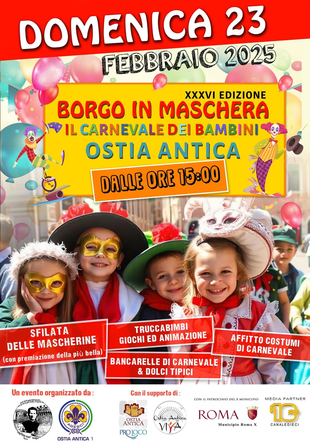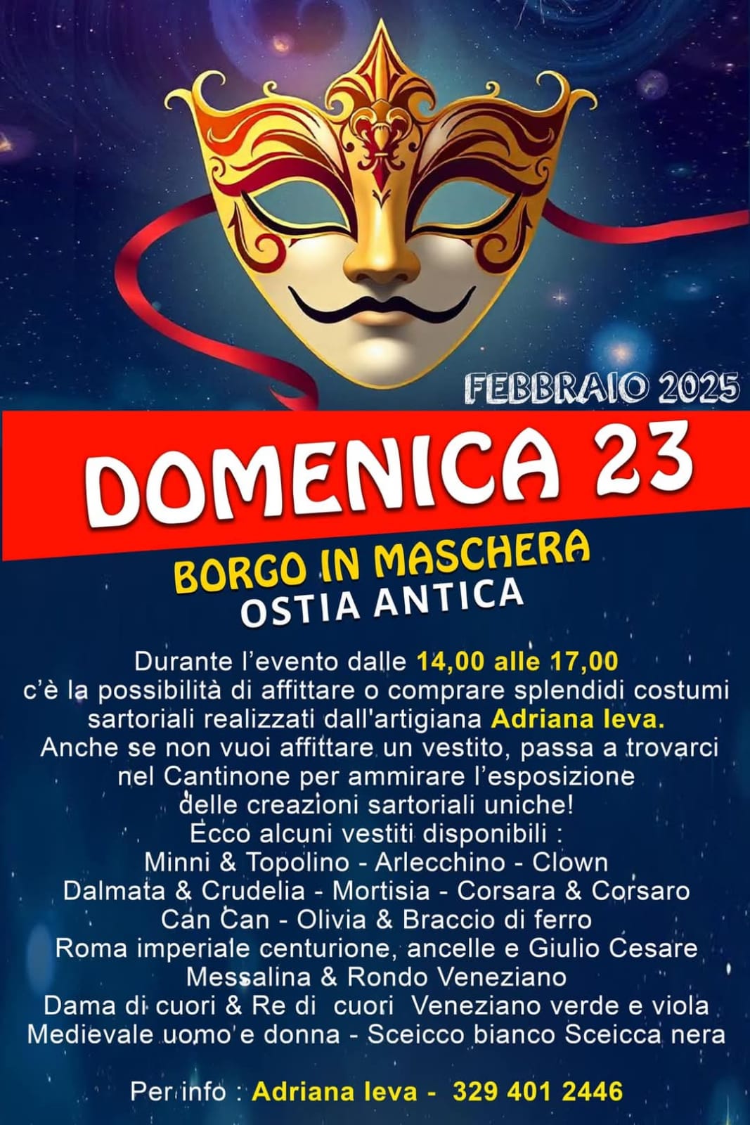 Sempre domenica 23 il Borgo di Ostia Antica, dalle 14, si animerà con la 36/ma edizione di “Borgo in Maschera-il Carnevale dei bambini“, organizzata dalla Parrocchia, con il supporto della Pro Loco ed in collaborazione con il gruppo Scout e l’Oratorio. In agenda la Sfilata delle maschere e la premiazione della più bella, in una cornice di giochi tradizionali, giostre, animazione ed un punto ristoro. La Pro Loco di Ostia Antica sostiene l’evento con il trucca bimbi e la possibilità di affittare splendidi costumi sartoriali realizzati dall’artigiana Adriana Ieva. Nel “Cantinone” sarà possibile ammirare l’esposizione delle creazioni sartoriali uniche.