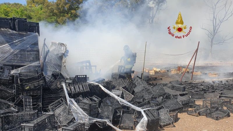 In fiamme un deposito di cassette di legno, circoscritta l’area interessata per evitare il propagarsi del fuoco