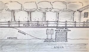 Riflettori dunque puntati sulla sponda dove insistono i resti dell’attraversamento a ridosso della pista ciclabile che da Porto conduce a Parco Leonardo. Il dislivello di circa 3 metri, che di fatto è il culmine dell’argine, verrà colmato con la realizzazione di una scala che dalla superficie della pista porterà i visitatori al livello del pilone (nella foto).