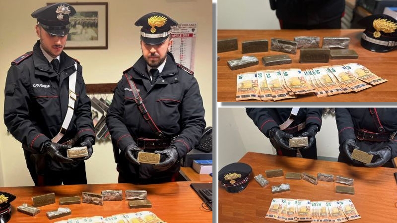 L’uomo è apparso subito nervoso e a quel punto i Carabinieri hanno deciso di verificare meglio. Nel corso di una ispezione, sono stati trovati 10 panetti di hashish, del peso complessivo di 1 kg, occultati, nel vano motore del veicolo, e la somma di 1.050 euro, ritenuta provento di attività illecite, nella tasca interna del giubbotto del 56enne.