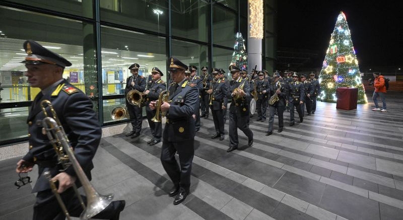 A dare il benvenuto alla Banda musicale ed ai passeggeri presenti, l ’Ing. Giorgio Gregori, Direttore della Business Unit Infrastrutture di Aeroporti di Roma. Oltre ad operatori aeroportuali, molti viaggiatori, adulti e bambini, italiani e stranieri, hanno filmato ed applaudito, a piu’ riprese, il concerto che ha visto risuonare dapprima la marcia d’ordinanza della Guardia di Finanza scritta dal maestro Antonio D’Elia, che è stato uno tra i più illustri Direttori del complesso bandistico, e poi le note di brani celebri come “Inglesina” di Davide Delle Cese, “Imagine” di John Lennon, “Arrivederci Roma” di Renato Rascel, “Nel blu dipinto di blu” di Domenico Modugno, prima di un bis natalizio con “Little Christmas Medley” e “Fantasie natalizie”. Quindi, la seconda parte dell’evento all’esterno del Terminal 1, dove la Banda ha eseguito le note dell’Inno Nazionale precedendo la tanto attesa accensione dell’Albero di Natale.