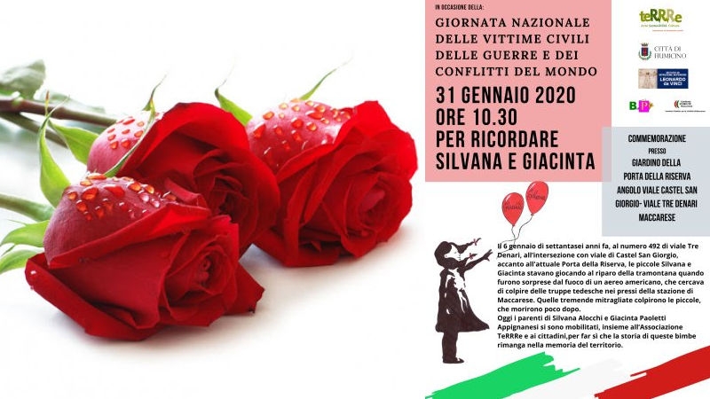 La giornata, organizzata dall’Associazione teRRRe e dal Comune di Fiumicino insieme ai parenti delle bambine in collaborazione con l’Istituto Superiore Leonardo da Vinci di Maccarese, la Biblioteca dei Piccoli e il Comitato Vivibilità Stazione Maccarese, si svolgerà in occasione della Giornata delle Vittime Civili delle Guerre e dei Conflitti del Mondo. La vicenda tornata alla luce dopo anni di oblio, permetterà a tutti coloro che passeranno per il Giardino della Porta della Riserva di conoscere la storia delle due piccole di Maccarese.