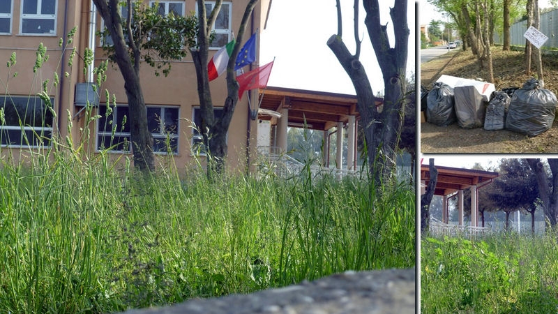 “Da alcune settimane la vegetazione ha cominciato a farsi largo nel giardino dell’istituto tanto da renderlo quasi inaccessibile ai piccoli studenti costretti a starsene in una piccola porzione – lo dichiara Paolo Sbraccia – il resto è out. L’erba è alta, insetti, scarafaggi e chissà cos’altro ci pascolano. A nome dell’associazione Il Piccolo Borgo chiedo all’amministrazione comunale, conscio dei problemi di budget e di cassa dovuti ai tagli dei governi centrali, di poter stanziare un piccolo fondo per la manutenzione interna dell’istituto. Con l’occasione vorrei segnalare anche diversi sacchi dell’immondizia abbandonati proprio nel confine esterno dell’istituto, dimenticati da quell’anima pia che, da solo, ha provveduto a tagliare la vegetazione esterna, al limite della scuola”.