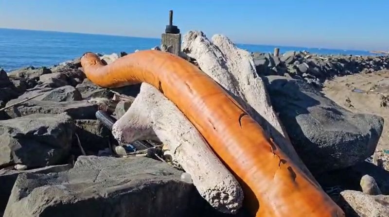 Sopra alla scogliera di Passo della Sentinella a Fiumicino, all’altezza dello sbocco di Fiumara grande, continua ad aumentare la presenza di grossi tronchi trasportati dal Tevere e depositati attorno ad una manichetta arancione che si è trasformata in un monumento all’incuria.