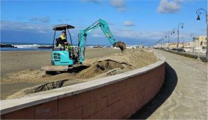 L’assessore all’Ambiente, Stefano Costa, si è fatto portavoce degli interventi nei punti impraticabili del lungomare, da piazzale Molinari fino a via Lucio Visentini. La ditta titolare di bonifica, vagliatura e rimozione dei rifiuti sulle spiagge si è presentata con due mezzi meccanici e diversi operatori. Con un bobcat è stata infatti prelevata la sabbia sulla pista e lungo il marciapiede per essere “riconsegnata” all’arenile, all’interno del muretto di contenimento, dove una ruspa ha poi provveduto a spianarla.